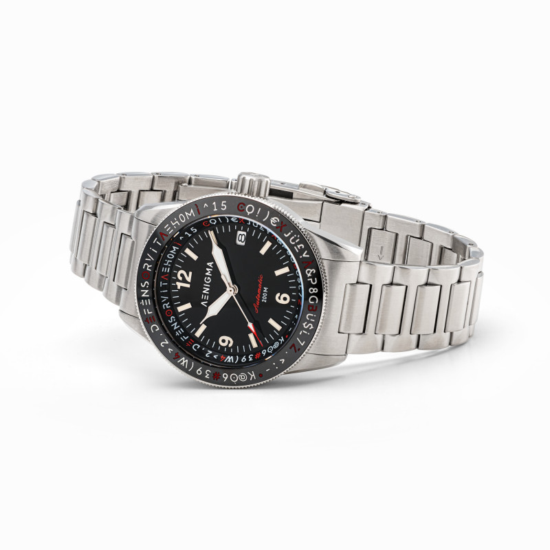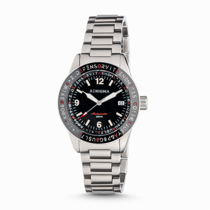 All’interno batte il movimento automatico Seiko NH35, sinonimo di affidabilità e precisione, con funzione datario. Il fondello a vite con incisione a rilievo sottolinea l’attenzione ai dettagli e la cura artigianale che contraddistingue ogni creazione Aenigma.