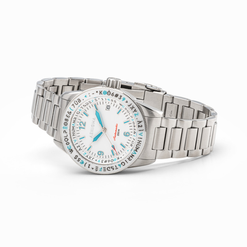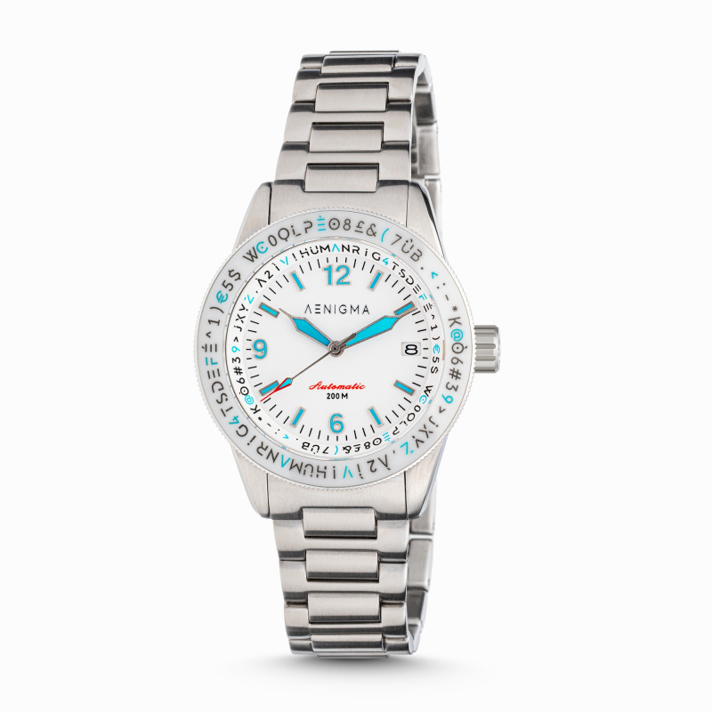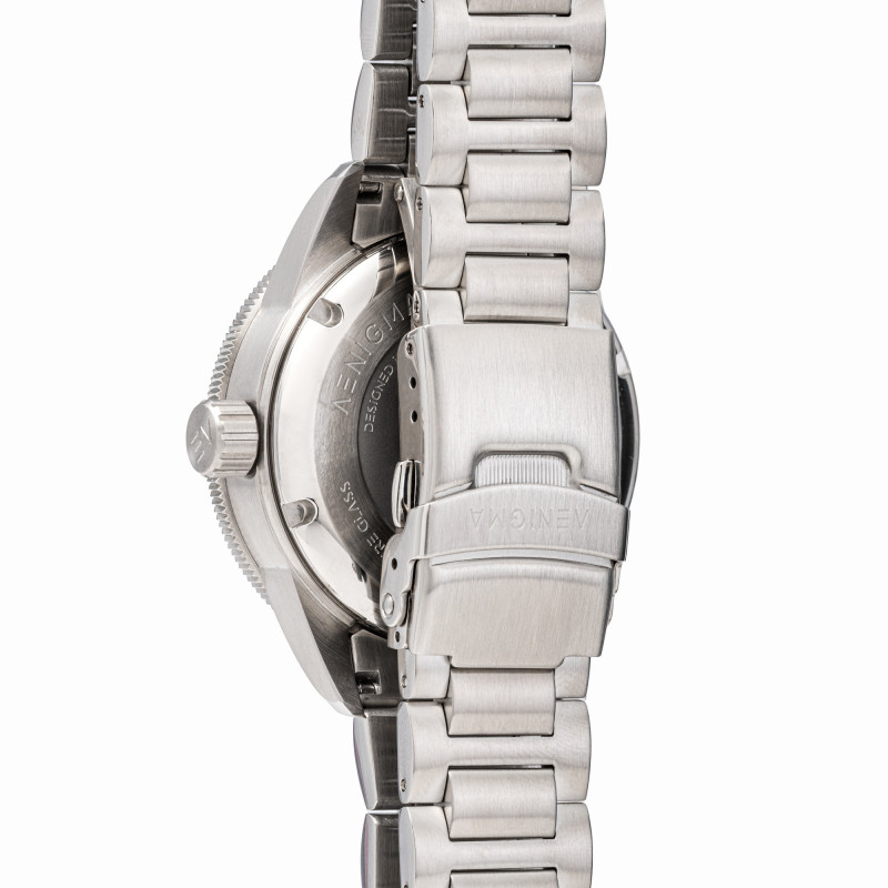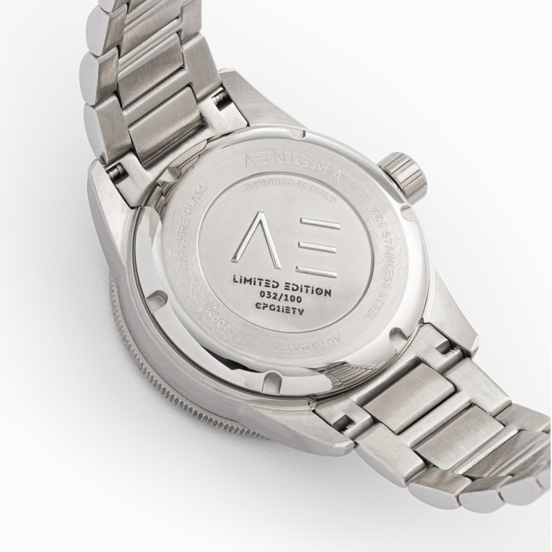 All’interno batte il movimento automatico Seiko NH35, sinonimo di affidabilità e precisione, con funzione datario. Il fondello a vite con incisione a rilievo sottolinea l’attenzione ai dettagli e la cura artigianale che contraddistingue ogni creazione Aenigma.