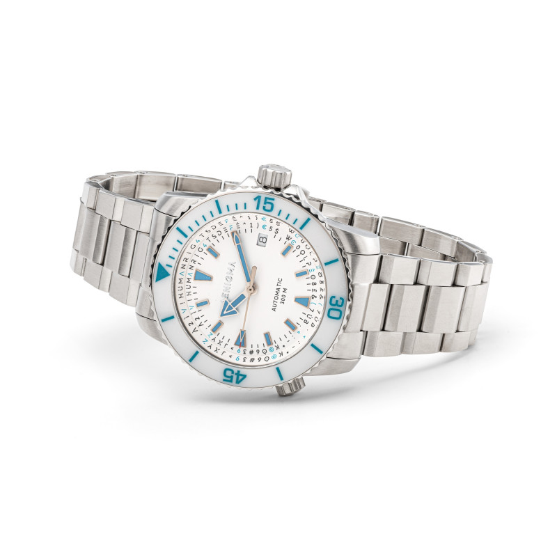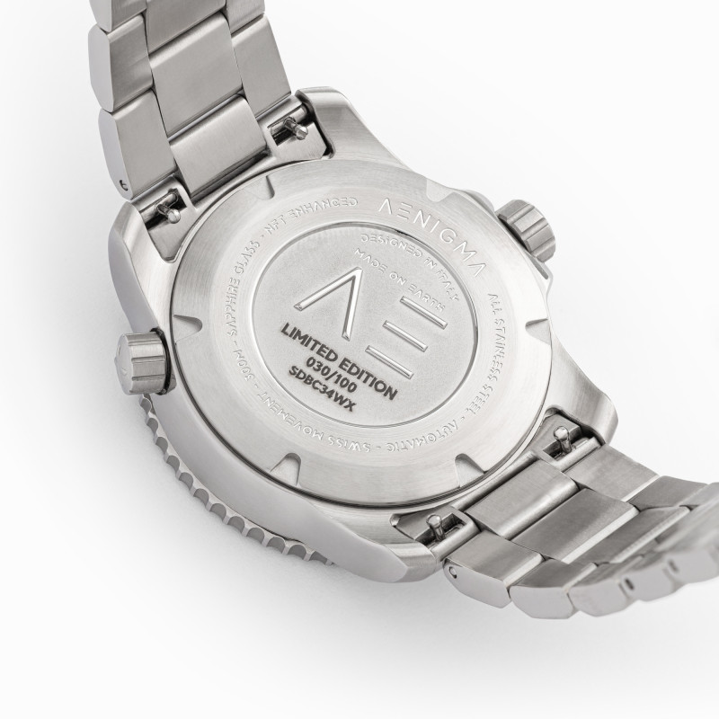 L’Aenigma SubX Rights Defender Bianco unisce eleganza sportiva e precisione meccanica svizzera in un design dal carattere deciso. La cassa da 42 mm in acciaio 316L, con finitura satinata e lucida, racchiude un quadrante bianco dalle linee pulite e leggibili, arricchito da indici applicati con Superluminova BGW9 per una visibilità perfetta in ogni condizione.